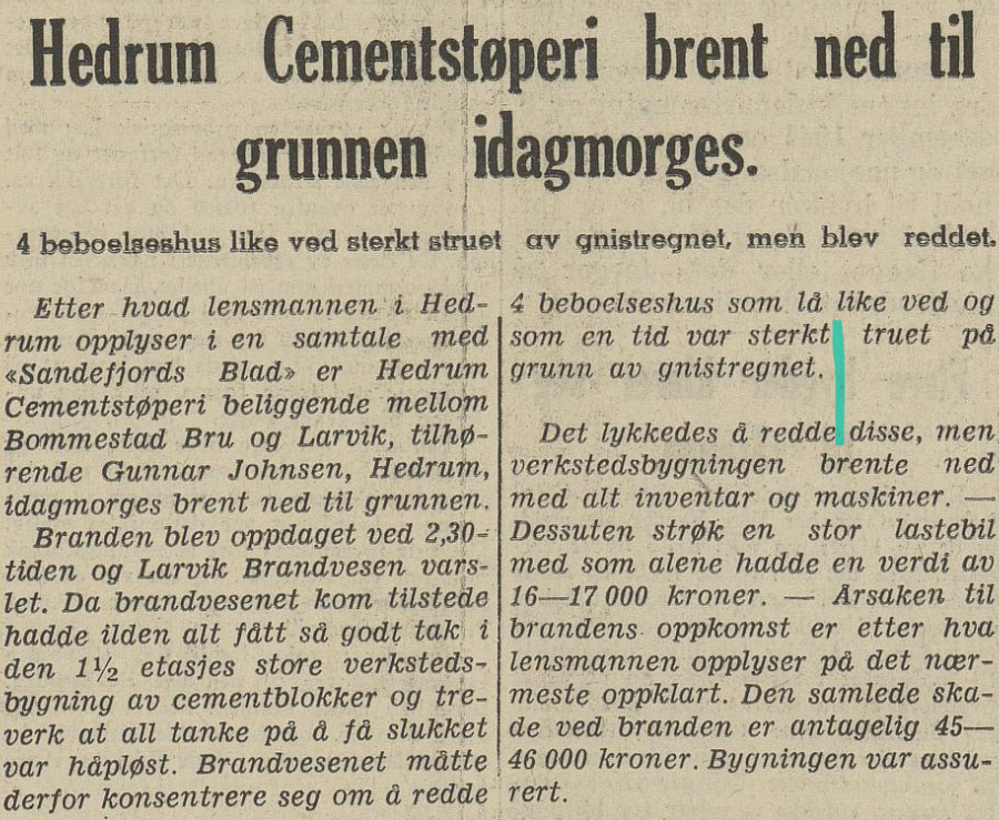 Fil:19450515 Sandefjords Blad - Hedrum cementstøperi brant ned.png