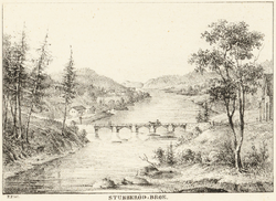 Bildet til høyre er det eldste vi har funnet. Det viser Bommstad-brua i 1836 og er et litografi laget av den danske tegneren og maleren Peter Frederik Wergmann.