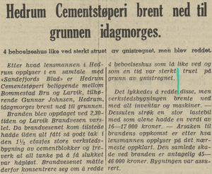 15. mai 1942 brant verkstedbygningen på sementstøperiet ned til grunnen. Også en ny Volvo lastebil brant opp. Skadene ble beregnet til ca 45.000 kr.[1]